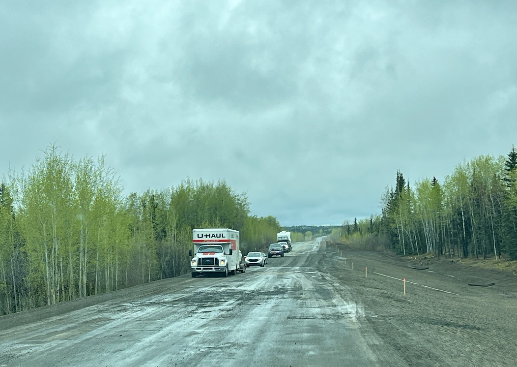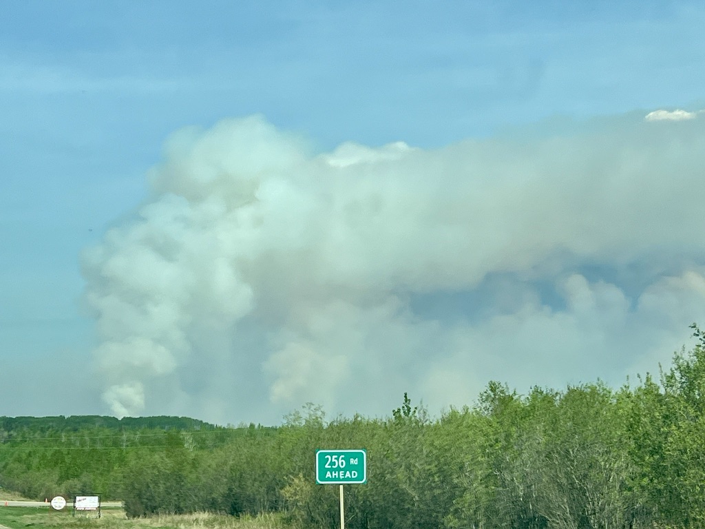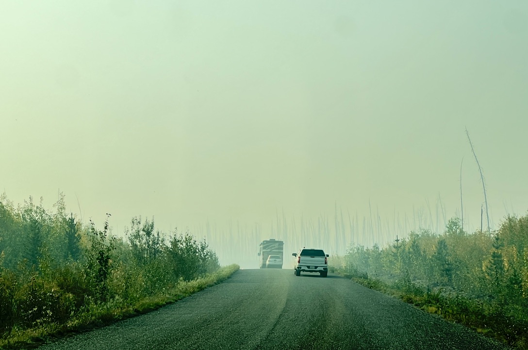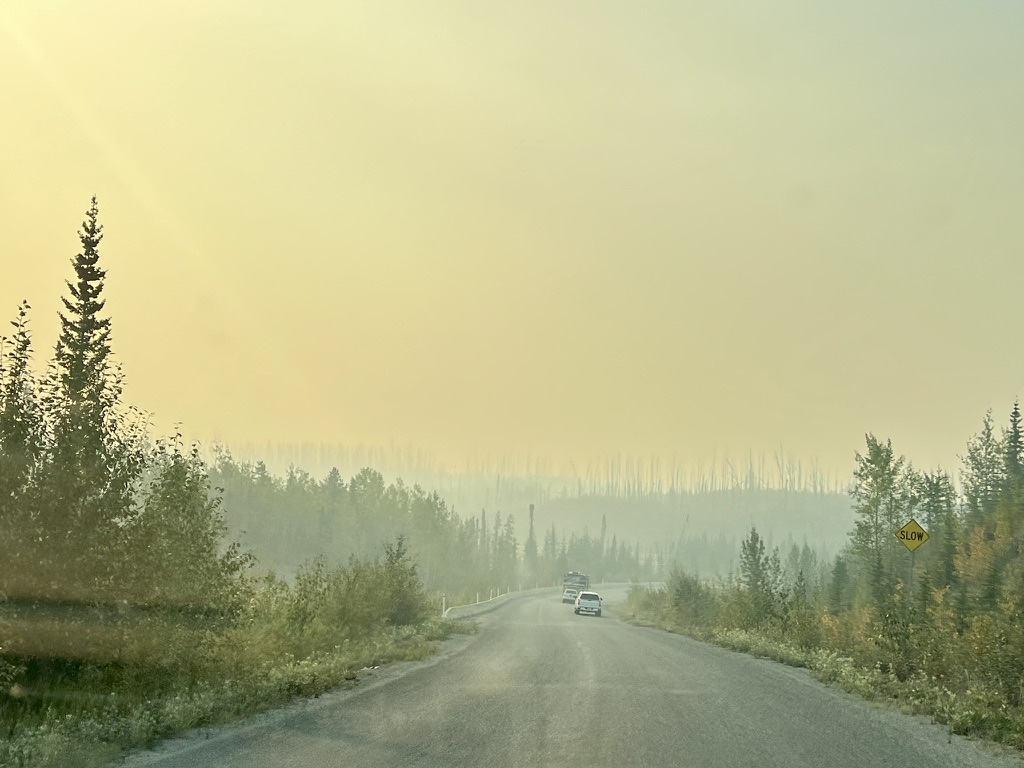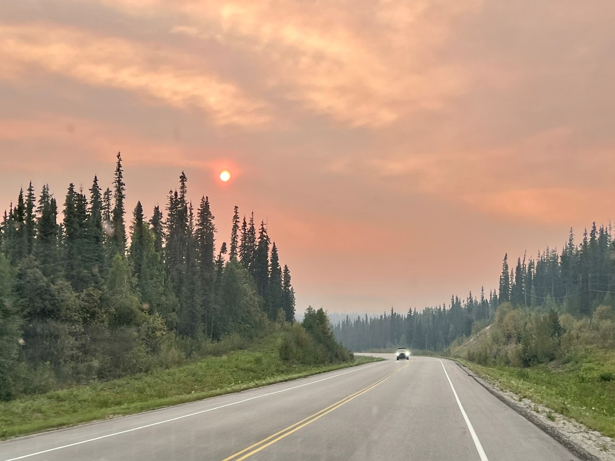 On the drive west from Edmonton we went through towns that were evacuated and a couple areas where fire had burned forest and structures along the highway. West of Dawson Creek a growing fire was threatening the Alaska Highway and affecting traffic at times. The day we drove through the wind was blowing away from the road and we were able to get through. We could see helicopters flying around the glowing smoke clouds as the battle continued.