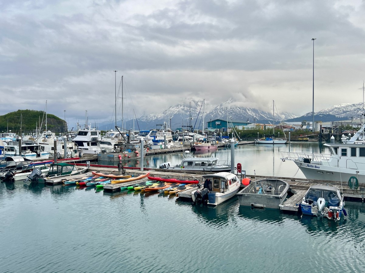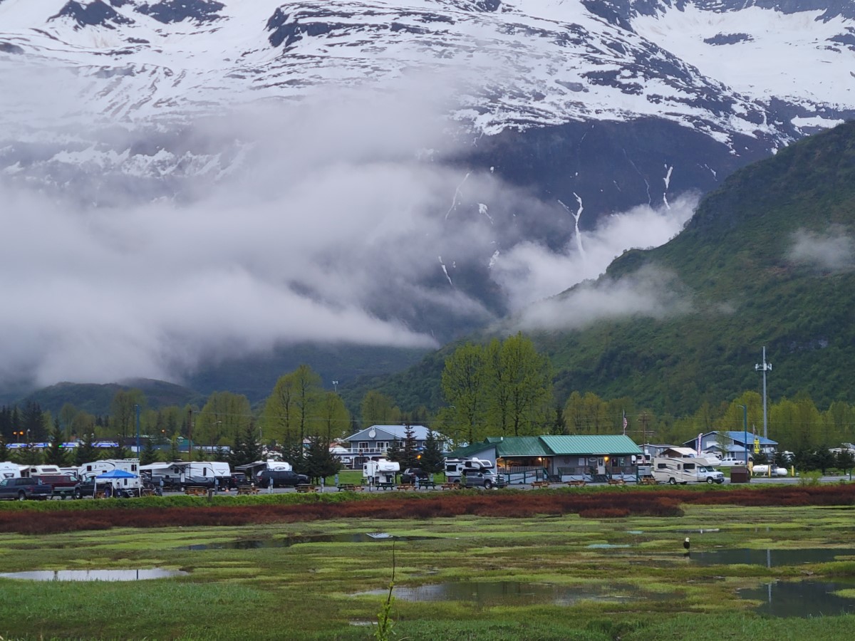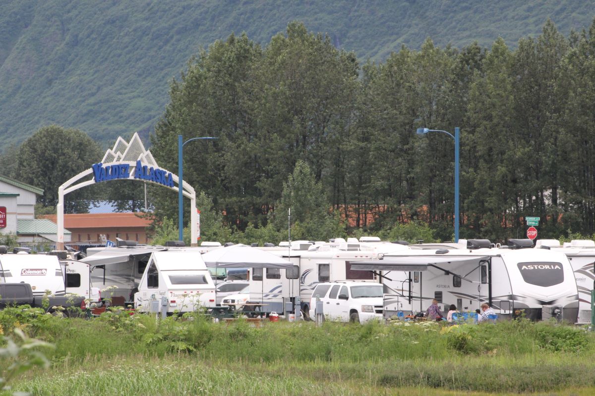 Though we made reservations in advance we weren’t able to find a campground in town where we could stay for the entire three months so we had to move periodically. However it did give us the chance to check out four different RV parks. The first was Eagles Rest. Later we spent a week at Bear Paw Two with the Camper backed up to the channel that leads into the harbor, allowing us to watch the interesting boat traffic from our back window. Next was the main Bear Paw RV Park and finally Valdez RV Park.