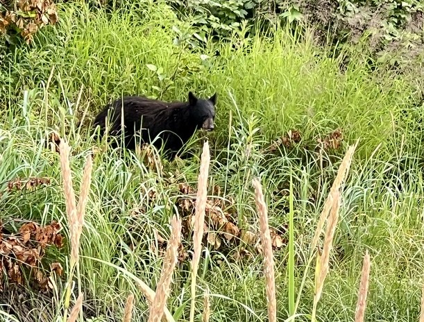 Our favorite stay on the way up was Liard Hot Springs just beyond the worst area of fires and we stayed two nights. We took the boardwalk out to the springs a few times and it was so nice to slow down and relax for a bit. The campground at Liard Hot Springs is surrounded by a tall wire fence to keep the wildlife out and you have to leave this enclosure to get to the springs. On one of our strolls down the boardwalk a moose crossed a couple hundred feet in front of us.