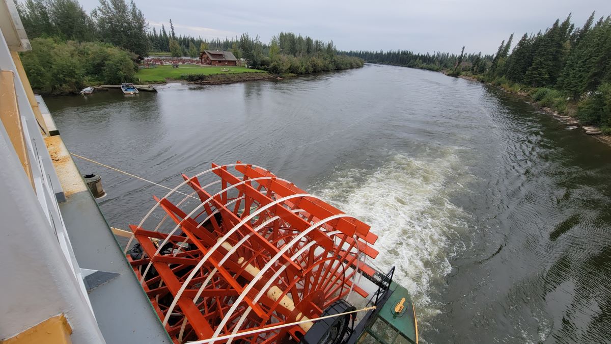 We left Valdez in mid-August and drove first up to Fairbanks for a river boat ride and to see our son one more time. Our stay at Rivers Edge RV Park was extended a few days because a stabilizer jack failed on the camper. We think what did it in was a construction zone we drove through on the Richardson Highway. In this particular one a dirt path went around and through a huge dip and we had to charge through in order to get back up the other side. The jack didn’t hit ground but it likely took a hard enough jolt to bust it.