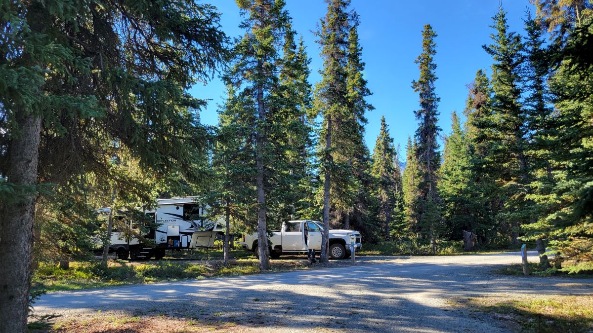Thanks to mobile techs Ryan and Paul we got back on the road. Heading down the Alaska Highway as we approached the border there was a large construction zone where they were repairing the awful roads we experienced in May. We were following an RV caravan and a motorcoach with a vehicle in tow apparently got caught in soft dirt and pulled to the right. We saw it bounce as it plowed into the back of a parked DOT pickup. The roads are definitely part of the adventure.